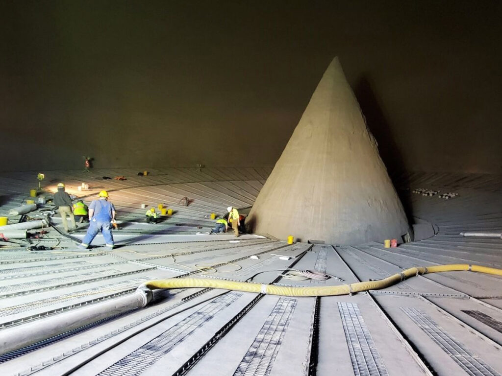 USA Silo Service can clean, inspect, and maintain your concrete storage dome. Most domes are situated at a 35-degree angle and can range from 150 to 250 feet in diameter. The unique shape of the storage dome creates a non-standard flow pattern that makes material build up much more likely and much more difficult to remove from dome walls and fluidizing equipment. Concrete storage domes suffering from restricted airflow need comprehensive cleaning and maintenance. Hardened stored material that is caked on dome walls needs to be removed through professional cleaning to return the dome to its original efficiency. Air pads and other fluidizing equipment may also need to be restored or replaced if there are signs of corrosion or defects affecting its usability. Bulk storage is the term for buildings that store bulk commodities such as cement, sand, frac sand, salt, fertilizer, feed, grains, aggregates, carbon, chips, seeds, peanuts, coke, blasting powder – and the list goes on. Regular professional silo cleaning is a necessary tool that ensures maximization of production while protecting employee safety. All too often, however, we postpone silo cleaning to delay the economic effects that downtime and lost production may bring. When regularly cleaned by a professional silo cleaning company, a silo yields maximum production while providing a safe working environment. So how do you have your silo regularly cleaned, minimize downtime and save money in the process? The USA Silo Service solution is employing The Boss proprietary silo cleaning method, which is 2/3 more powerful than conventional cleaning methods. Since The Boss moves more material per hour, our system delivers optimal cleaning quickly and correctly, resulting in less downtime and production loss, ultimately saving you money. So don't put off that silo cleaning any longer. Let The Boss silo cleaning machine and USA Silo Service help you get back on a regular silo cleaning schedule to maximize your efficiency, production and safety. Contact us for a dome silo cleaning quote.